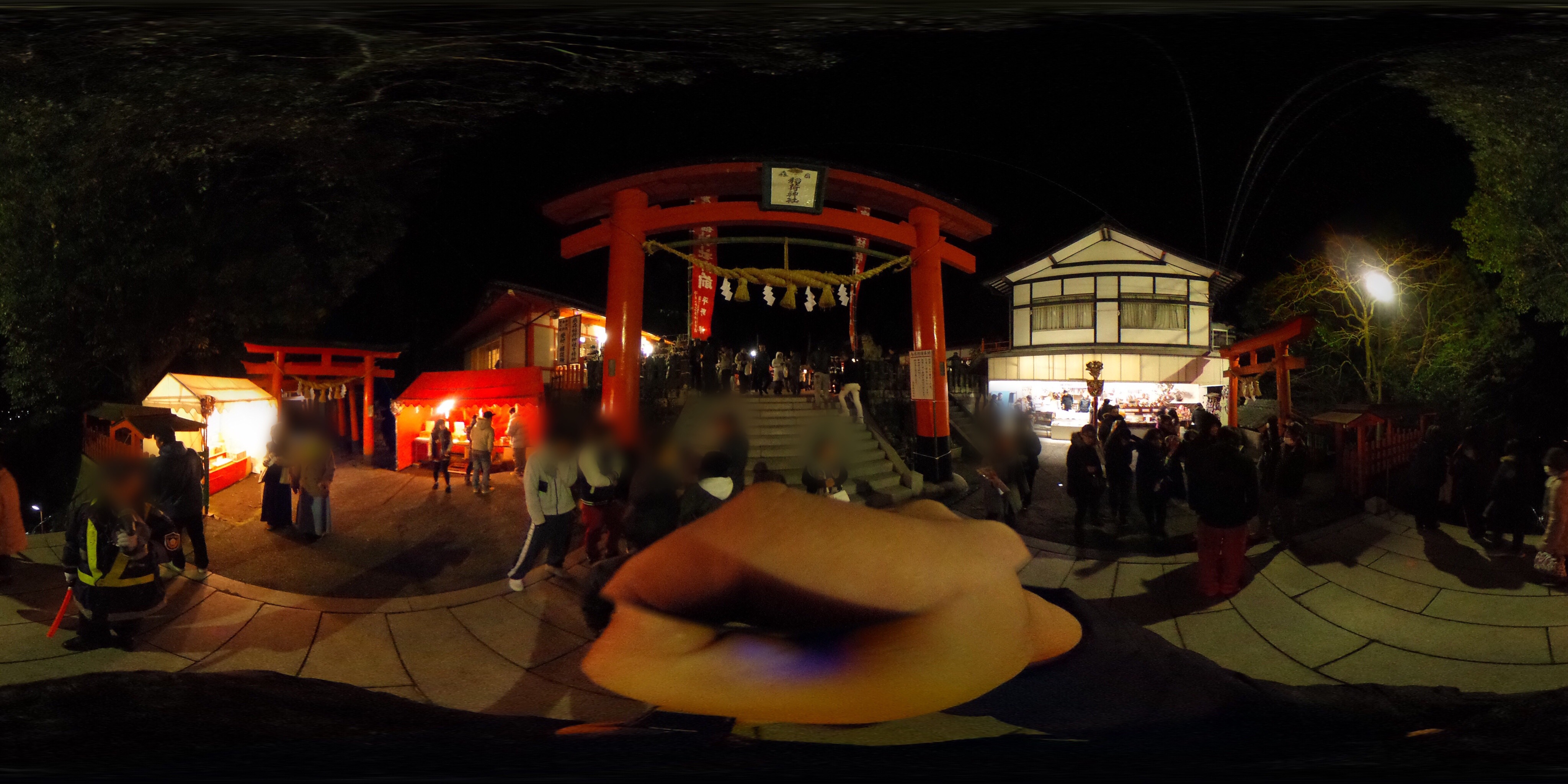 参道には、お面屋、たこ焼き、くじ引きなどの出店が所せましとならび、呼び込みの声と、行き交う人々の新年の挨拶でとても賑やかです。